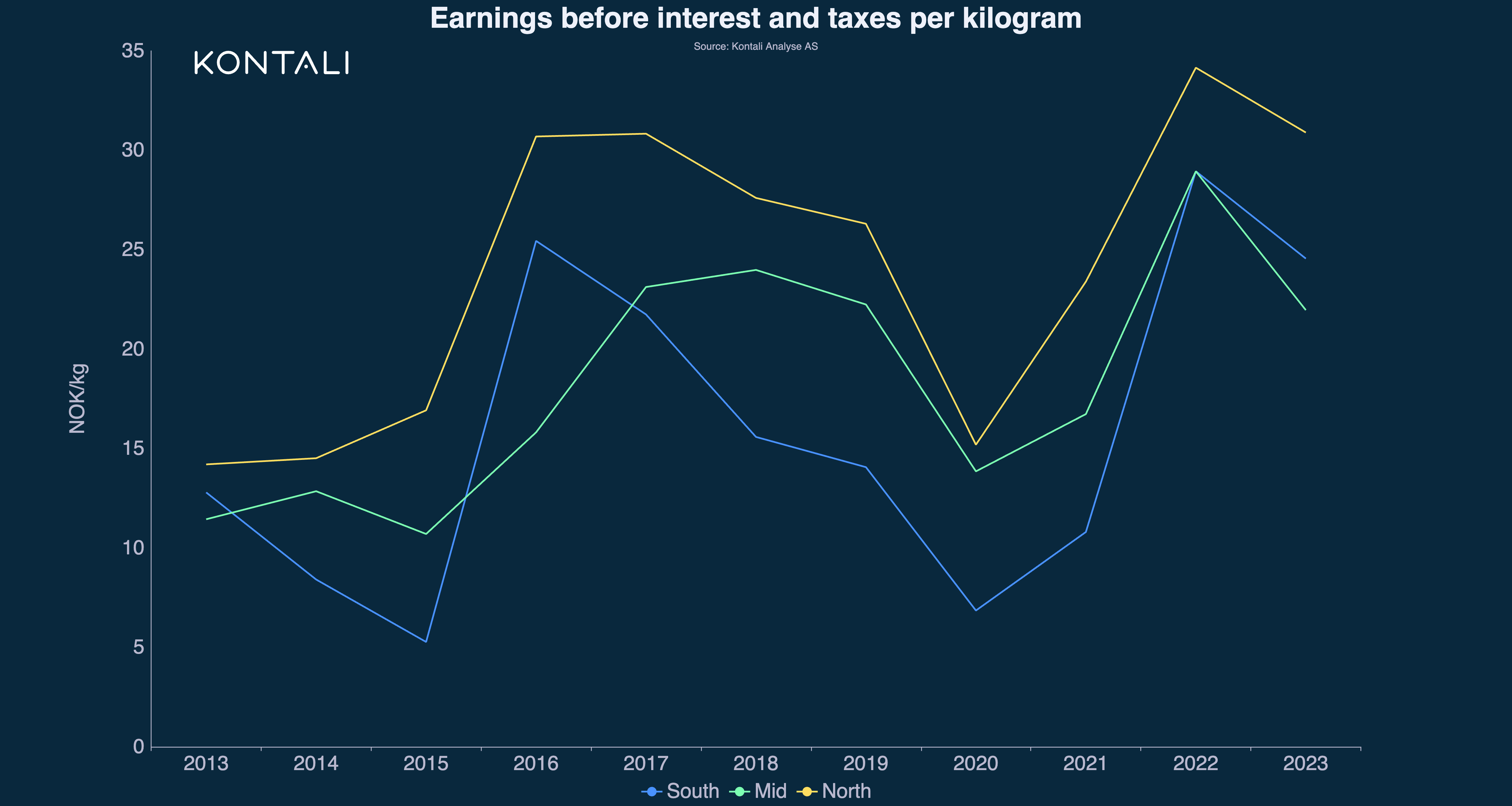 In the mid-sized company segment, Alsaker outperformed its already strong 2022 results, recording an impressive 36.9 NOK/kg, up from 36.1 NOK/kg. Eidsfjord Sjøfarm followed closely with an EBIT of 36.4 NOK/kg, while Salaks and Kobbevik & Furuholmen tied for third place at 33.3 NOK/kg.