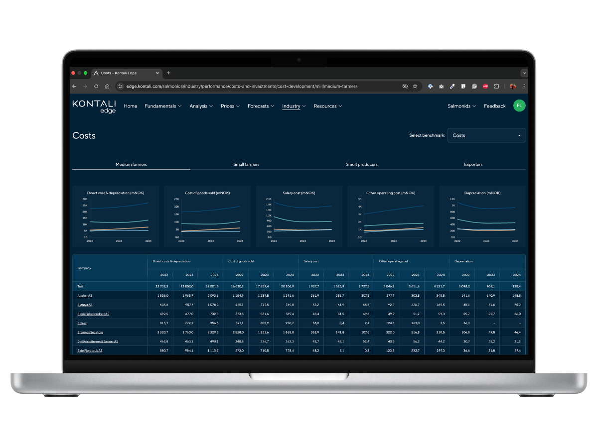 Kontali’s Industry analysis is built on official financial statements, company disclosures, registers, and data reported directly to Kontali. Standardized metrics such as EBIT, harvest volumes, and license utilization ensure a representative and comparable benchmark of global salmon industry performance.