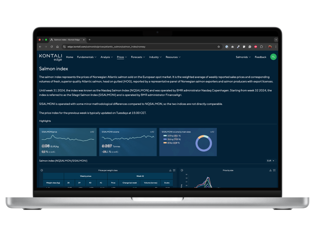 The Salmon Index is built on weekly reported export prices and volumes of Norwegian Atlantic salmon (HOG) from a verified exporter panel. Data accuracy is maintained through standardised collection and consistent weighting. The index transitioned from NQSALMON (Nasdaq Copenhagen) to SISALMONI (FinanceAgri) in August 2024, while keeping the same benchmarking principles. Prices are shown per weight class in EUR/kg, with indicators reflecting weekly changes.