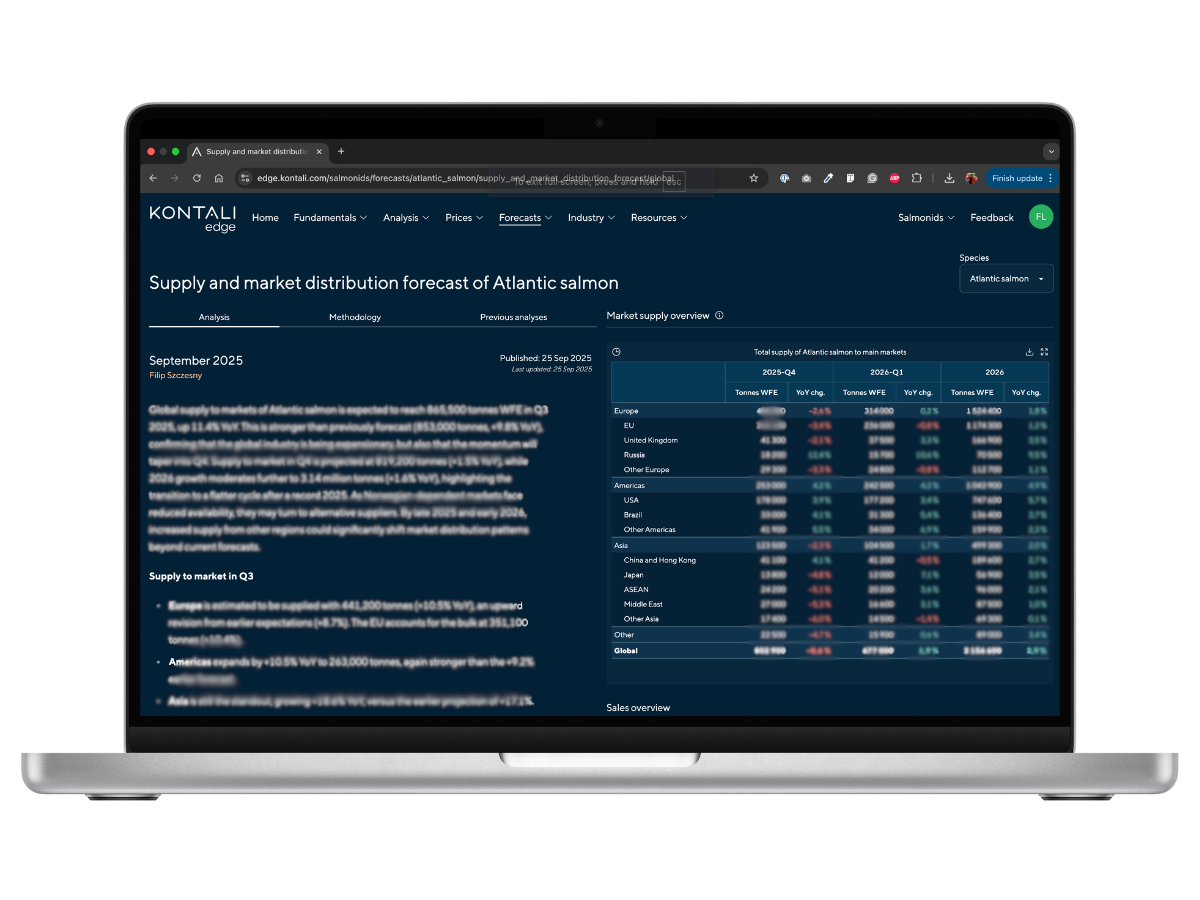 As salmon trade grows more complex and interconnected, strategic clarity is harder to achieve. Kontali’s expanded model goes beyond traditional market groupings, uncovering new regional dynamics and early growth signals that producers, exporters, and analysts can leverage to strengthen competitive positioning and anticipate shifts before they happen.